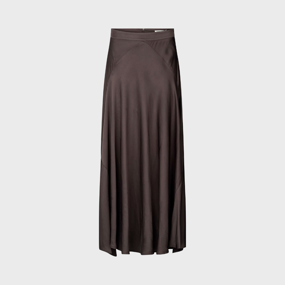 Lush-nederdelen fra Rabens Saloner er en smuk kombination af enkelthed og elegance. Med sin flatterende A-form og bløde, skinnende overflade falder nederdelen smukt om kroppen og bevæger sig elegant med dig. Den høje talje og diskrete syninger giver et sofistikeret udtryk, der gør den ideel til både hverdag og særlige anledninger.