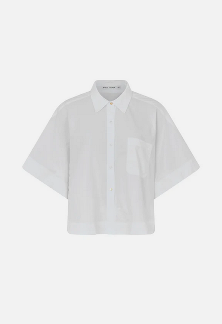 Cool skjortekjole fra Rabens Saloner er karakteriseret af en boxy, kort pasform med mellemlange, oversize ærmer, knaplukning hele vejen ned, brystlomme og en rund kant.